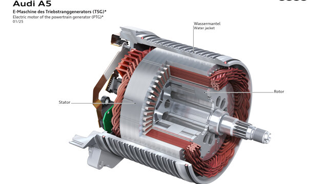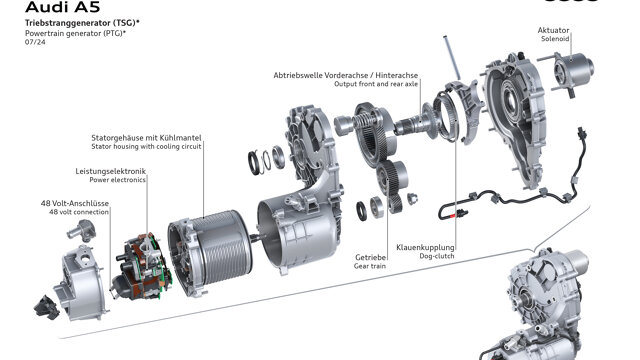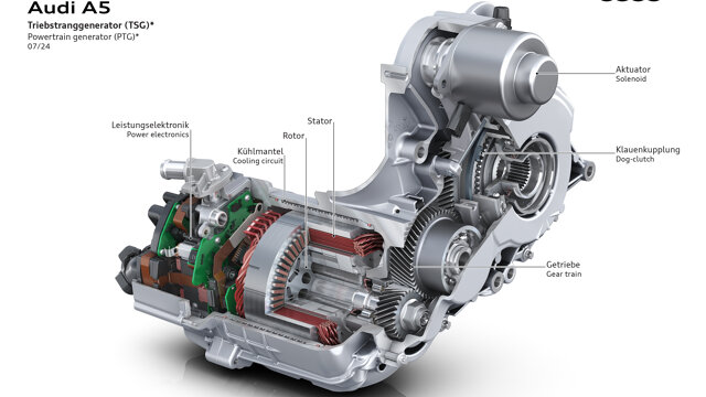 De PTG beschikt over een geïntegreerde, elektronische aansturing en is direct gemonteerd op de uitgaande as van de transmissie. Hij kan bij snelheden tot 140 km/u voor een elektrische vermogensboost van maximaal 18 kW/24 pk zorgen. Daarmee accelereert een Audi met MHEV plus nog krachtiger en soepeler, zeker vanuit stilstand, omdat het maximumkoppel van de elektromotor (230 Nm) direct na het starten van de auto al beschikbaar is. Boven 140 km/u wordt de PTG automatisch losgekoppeld van de aandrijflijn.